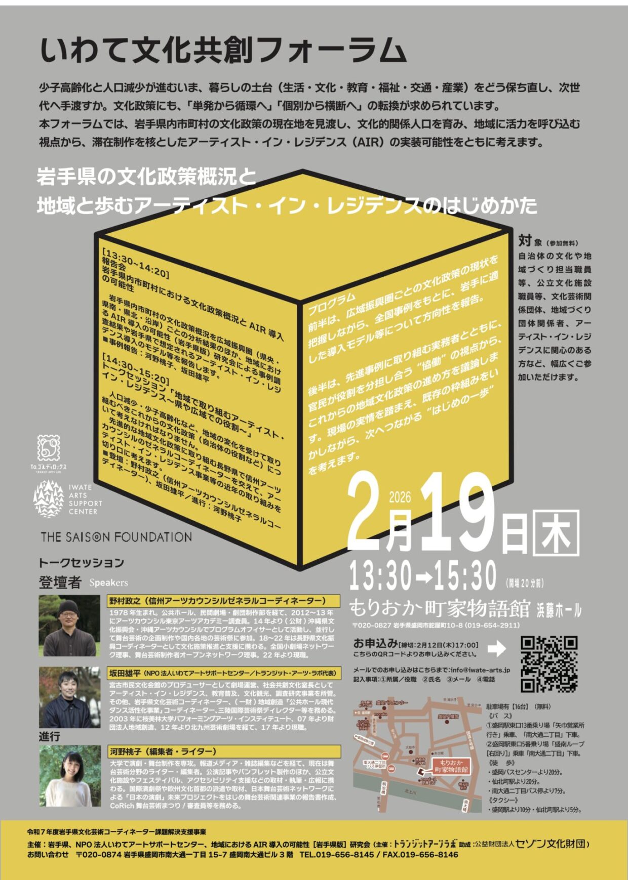 本フォーラムでは、岩手県内市町村の文化政策の現在地を見渡し、文化的関係人口を育み、地域に活力を呼び込む視点から、滞在制作を核としたアーティスト・イン・レジデンス(AIR)の実装可能性をともに考えます。